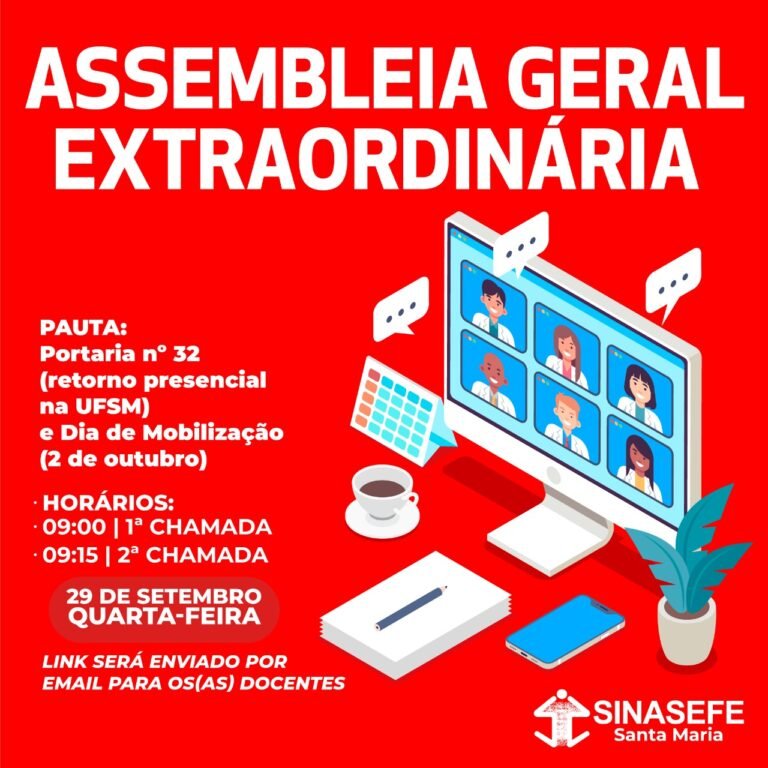 A portaria nº 32, que determina o retorno das atividades administrativas presenciais na UFSM a partir desta sexta, 1º de outubro, será pauta da assembleia convocada pelo Sinasefe para a manhã da quarta-feira, 29, com primeira chamada às 9h e segunda chamada às 9h15. Como já é usual, os(as) filiados(as) receberam o link de acesso à sala virtual em seus e-mails. Além da portaria, também estará em debate na plenária a organização das atividades de mobilização do próximo sábado, 2, quando Santa Maria (e dezenas de outras cidades brasileiras) irá registrar mais um ato contra as políticas negacionistas e antipopulares do governo federal.