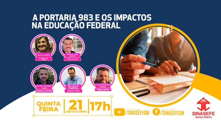 Para discutir de forma mais cuidadosa os impactos que a Portaria trará para os(as) docentes da Rede Federal, o Sinasefe Santa Maria promove uma live no dia 21 de outubro, às 17h, com a presença dos(as) seguintes convidados(as): Carla Jardim (ex-reitora do IFFarroupilha); Carlos Rodrigo Lehn (Pró-Reitor de Desenvolvimento Institucional do IFFar e coordenador do Grupo de Trabalho responsável por regulamentar a Portaria na instituição); Jeferson Lopes Queiroz (presidente da Comissão Permanente de Pessoal Docente – CPPD do IFFar) e Heverton Padilha (assessor jurídico integrante do escritório Wagner Advogados). A mediação do debate ficará por conta de Lucas Martins Flores, docente do campus de Jaguari do IFFar.