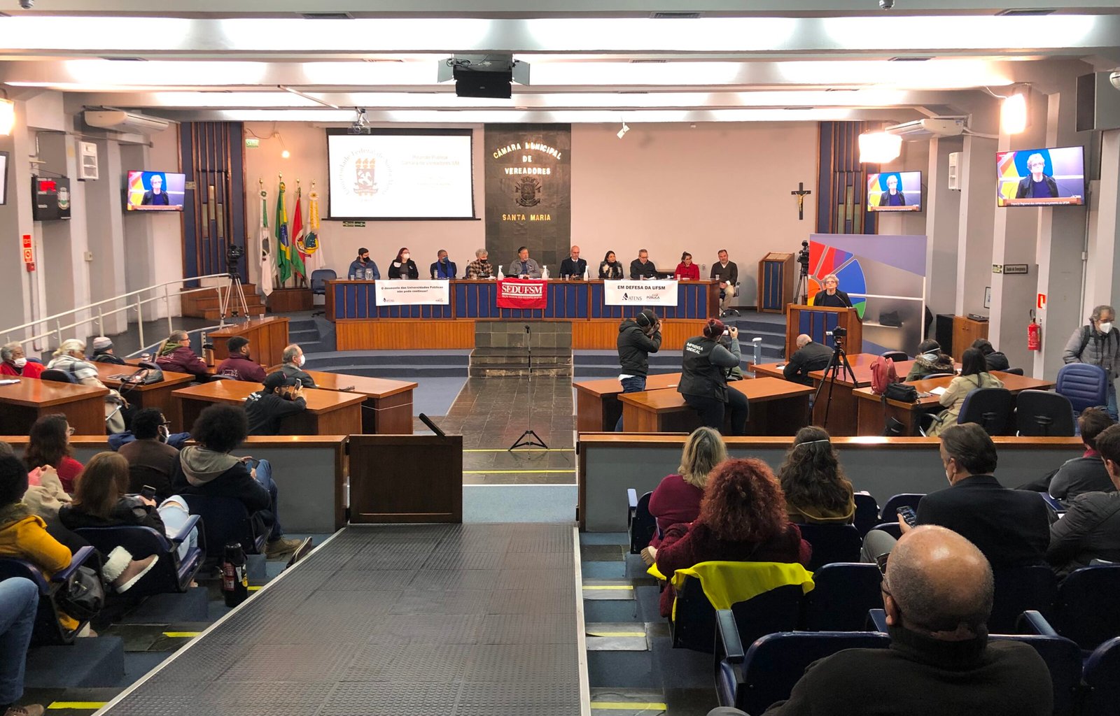 Com o intuito de expor o caos financeiro enfrentado pela UFSM desde o início de 2022, devido a cortes de orçamento cada vez maiores, foi realizada uma Reunião Pública na Câmara de Vereadores de Santa Maria na última segunda-feira, dia 20. A ação contou com a participação do Sinasefe, do reitor e da vice-reitora da UFSM, Luciano Schuch e Martha Adaime, de vereadores locais, do deputado Valdeci Oliveira (presidente da Assembleia Legislativa do estado do Rio Grande do Sul), do chefe de gabinete do prefeito Jorge Pozzobom, Alexandre Lima, de outras entidades sindicais e estudantis, como DCE, SEDUFSM, ASSUFSM, ATENS, MNU e APG, e da comunidade santa-mariense em geral.
