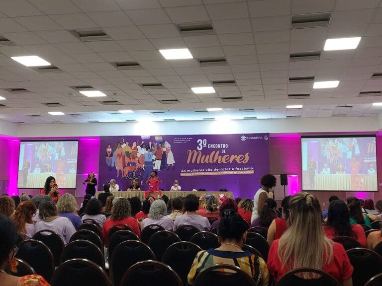 Na manhã desta sexta-feira, 19, ocorreu a primeira mesa temática da terceira edição do Encontro Nacional de Mulheres do Sinasefe. Com o tema ‘’Por um sindicato feminista, antirracista, anticapacitista, anticapitalista e socialista: as mulheres como vanguarda da construção de um SINASEFE combativo’’, o debate aconteceu no Praia Centro Hotel, em Fortaleza-CE, e contou com a presença das palestrantes Rivania Moura (presidenta do ANDES-SN), Lucrécia Lacovino (Sinasefe), Sônia Adão (Sinasefe) e Rosângela Costa (direção nacional da Fasubra).