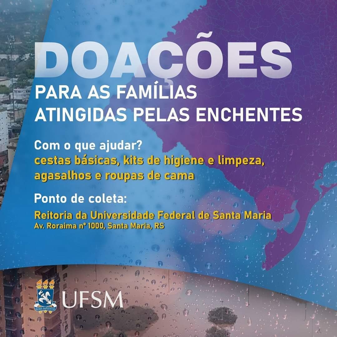 As doações devem ser deixadas no ponto de coleta instalado na reitoria da UFSM (Avenida Roraima, n° 1000, Santa Maria).