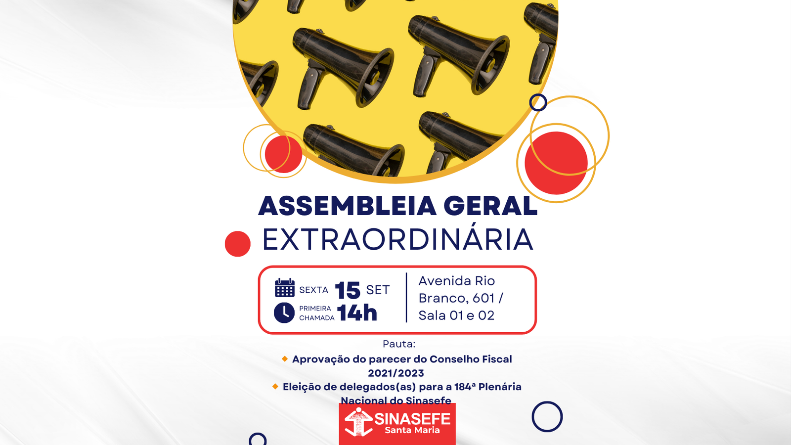 Nesta sexta-feira, 15 de setembro, o Sinasefe Santa Maria promove Assembleia Geral Extraordinária para discutir dois pontos de pauta: 1. Aprovação do parecer do Conselho Fiscal 2021/2023; 2. Eleição de delegados e delegadas para a 184ª Plenária Nacional, que ocorrerá nos dias 23 e 24 de setembro, em Brasília-DF.