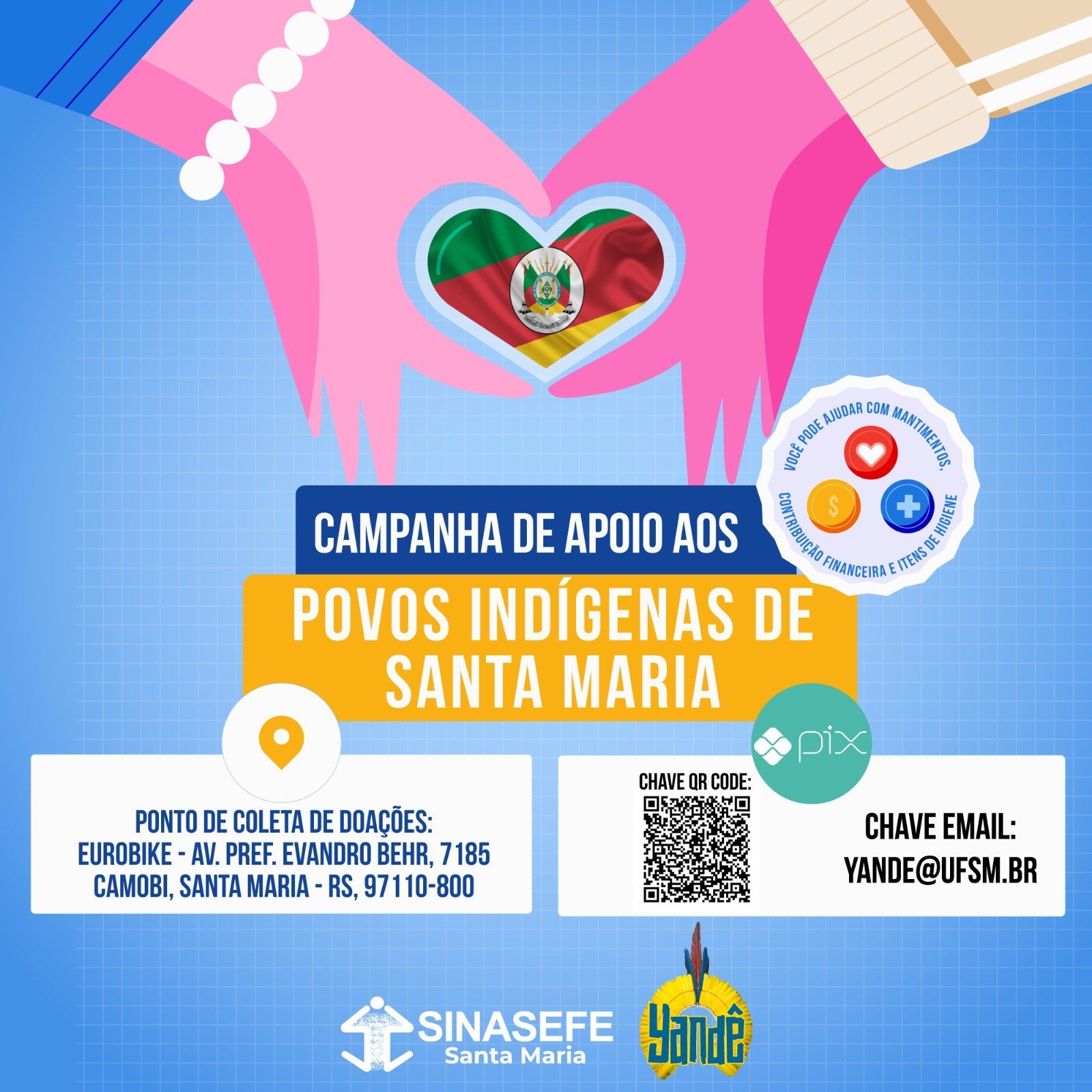 Para ajudar, você pode doar dinheiro via pix, por meio da chave e-mail yande@ufsm.br , ou itens de maior necessidade no momento, que são: produtos de higiene (como escovas e pasta de dente, sabonetes, absorventes, shampoo e condicionador), alimentos, água e recipientes d’água.