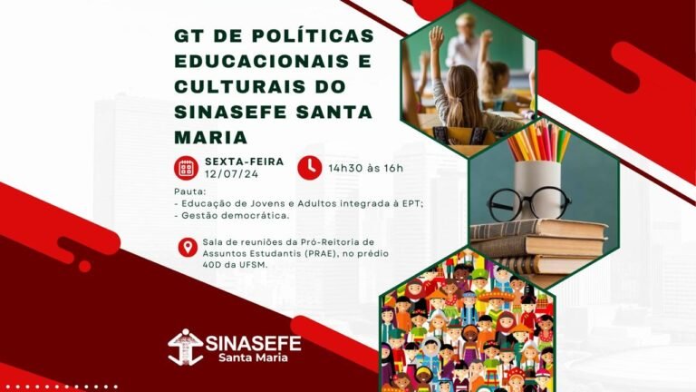 O Grupo de Trabalho de Políticas Educacionais e Culturais do Sinasefe Santa Maria promove reunião nesta sexta, 12 de julho. O encontro, que vai das 14h30 até as 16h, ocorre na sala de reuniões da Pró-Reitoria de Assuntos Estudantis (PRAE), no prédio 40D da UFSM. A atividade tem como pauta a discussão de dois itens do caderno de políticas: