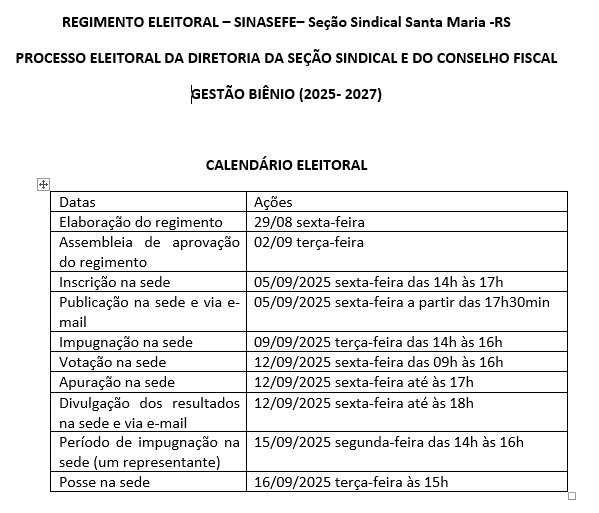 Durante a assembleia realizada pelo Sinasefe Santa Maria na tarde de terça, 2 de setembro, foi aprovado o regimento das eleições para escolha da nova diretoria da entidade relativo ao biênio 2025-2027. Junto com o regimento também foi aprovado o calendário do processo eleitoral, que pode ser conferido mais abaixo. Confira mais abaixo tanto o regimento eleitoral como também o calendário eleitoral.