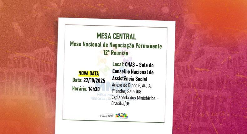 A 12ª reunião da Mesa Central da Mesa Nacional de Negociação Permanente (MNNP) – a 3ª realizada em 2025 – foi convocada para esta quarta, 22 de outubro, às 14h30min, em Brasília-DF.