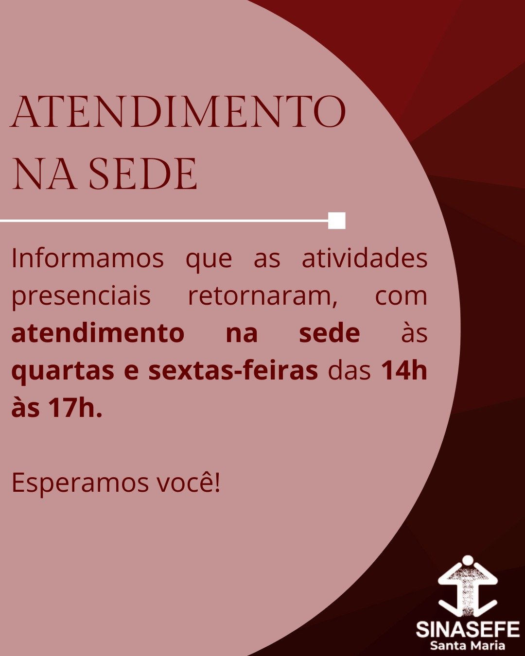 Para filiados e filiadas ao Sinasefe de Santa Maria, a diretoria informa que o atendimento presencial já voltou a ocorrer após o recesso de final de ano. Desde esta quarta, 14 de janeiro, o atendimento retornou: das 14h às 17h, todas as quartas e sextas-feiras.