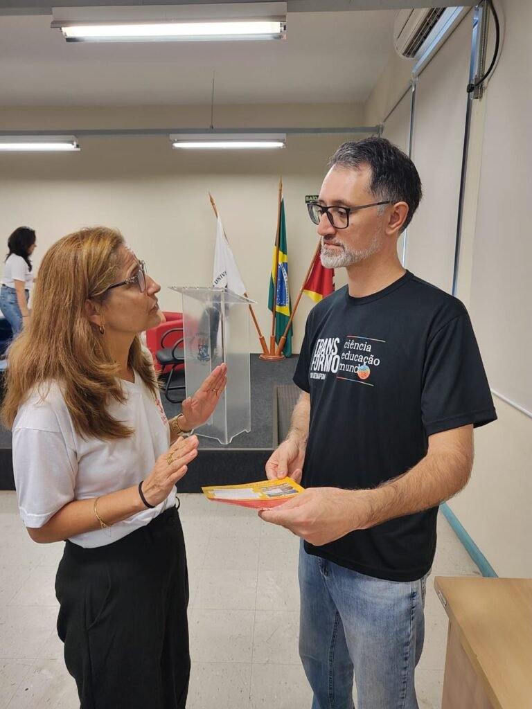 Durante a roda de conversa, a coordenadora-geral da seção sindical, Cláudia do Amaral, entregou um material impresso sobre a necessidade de valorização do segmento EBTT ao presidente da Sedufsm, Everton Picolotto (foto). Esse mesmo material foi entregue às demais entidades e, segundo ela, todas e todos presentes ao debate ficaram bastante sensibilizados/as com a demanda trazida pela entidade.